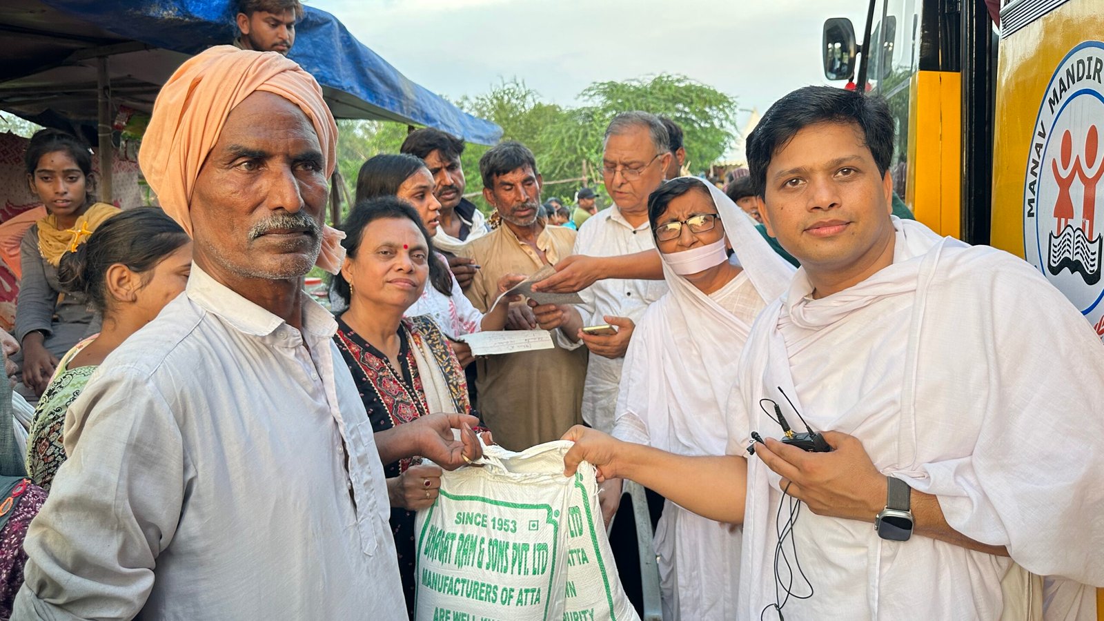 Date: 12 Jul, 2023Responding to the severe flood at the refugee settlements, Manav Mandir Mission distributed ration essentials among displaced refugees from Pakistan.