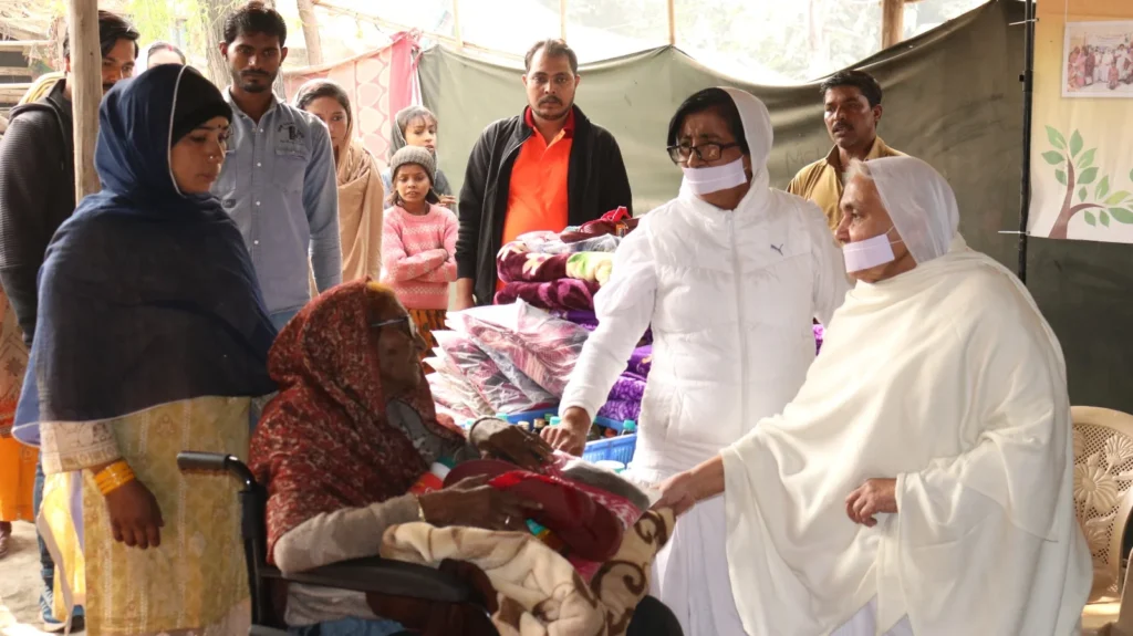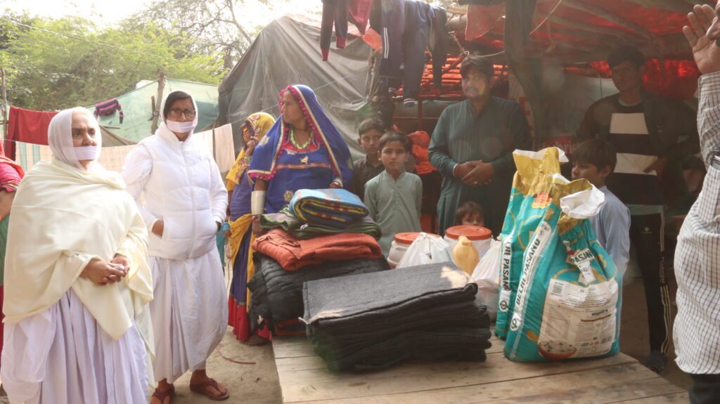 Distribution of winter clothes, blankets, shoes, nutritional food, and multivitamins at Mahasati Manjulashree Matri Seva Kendra near Signature Bridge, Delhi, for Hindu refugees displaced from Pakistan